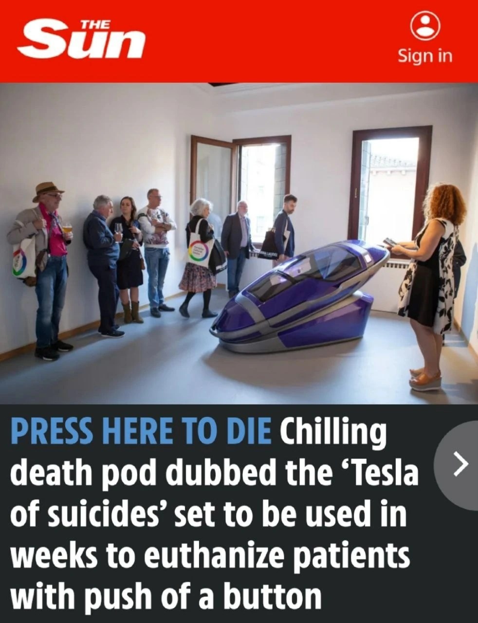 “Stlačte tlačidlo, aby ste zomreli. Smrtiaca kapsula, prezývaná “Tesla samovrážd”, bude slúžiť na eutanáziu pacientov jediným kliknutím na tlačidlo: spoločnosť Progressive Swiss uvádza na trh “samovražednú kapsulu”…