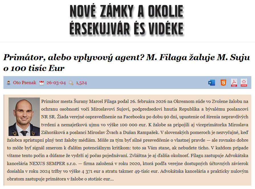 Primátor mesta Šurany Marcel Filaga podal 26. februára 2026 na Okresnom súde vo Zvolene žalobu na ochranu osobnosti voči Miroslavovi Sujovi, podpredsedovi hnutia Republika a bývalému poslancovi NR SR.